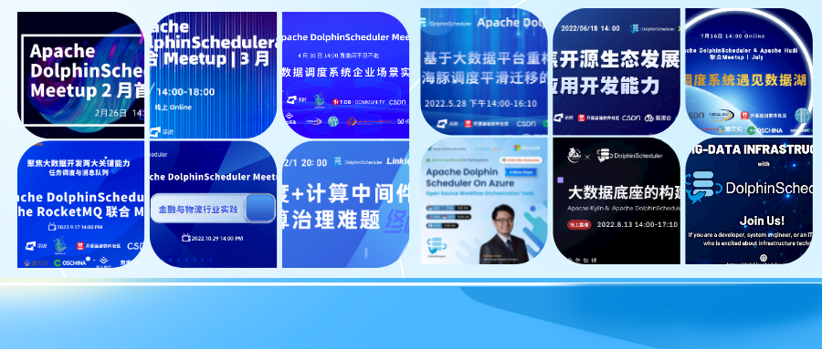 Meetup 活动由 Apache DolphinScheduler 社区主办,平均每个月举办一期,主要面向大数据开发者及爱好者人群,通过一线工程师的实践分享,帮助社区开发者提升技能及知识,为链接全球的社区用户创造更大的价值。国内 Meetup 已连续成功15场,吸引超过 60000+ 技术爱好者参加。