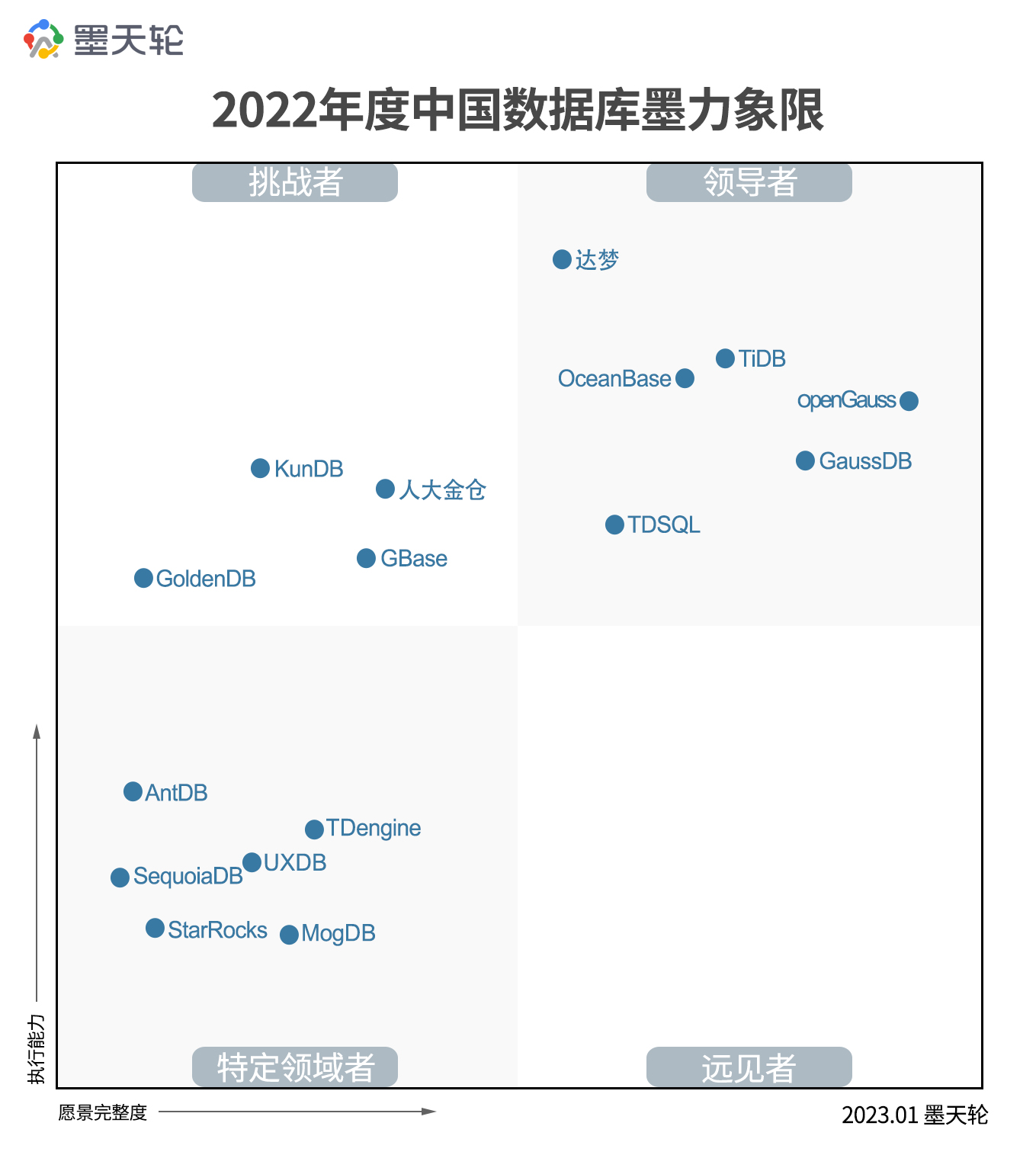 openGauss 自2022年12月以来,已经连续三个月摘得探花。 2022年其联合了10+企业,在多地开展了openGauss Meetup,有效地提升了在各地的知名度,热度也有显著的提升。近日,其成功入选 《墨天轮2022年度中国数据库墨力象限》 中的领导者象限,代表 openGauss 产品及服务能力强,市场销售表现好,客户满意度较高,同时有清晰完整的未来战略。
