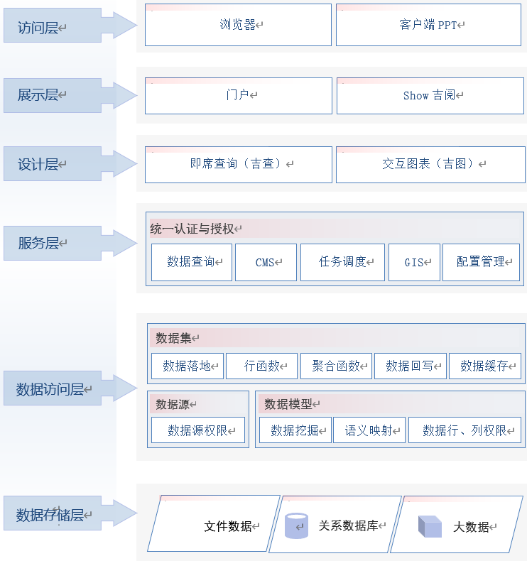 应用于多种展现平台:GBaseBI V5以J2EE为基础,采用WEB2.0技术,可广泛的应用于Web,Pad,Mobile等多种展现平台,实现了跨平台操作,客户端只需要支持Flash player 11.2及以上插件就可以访问系统,减少了产品的部署工作,便于产品的维护和升级。