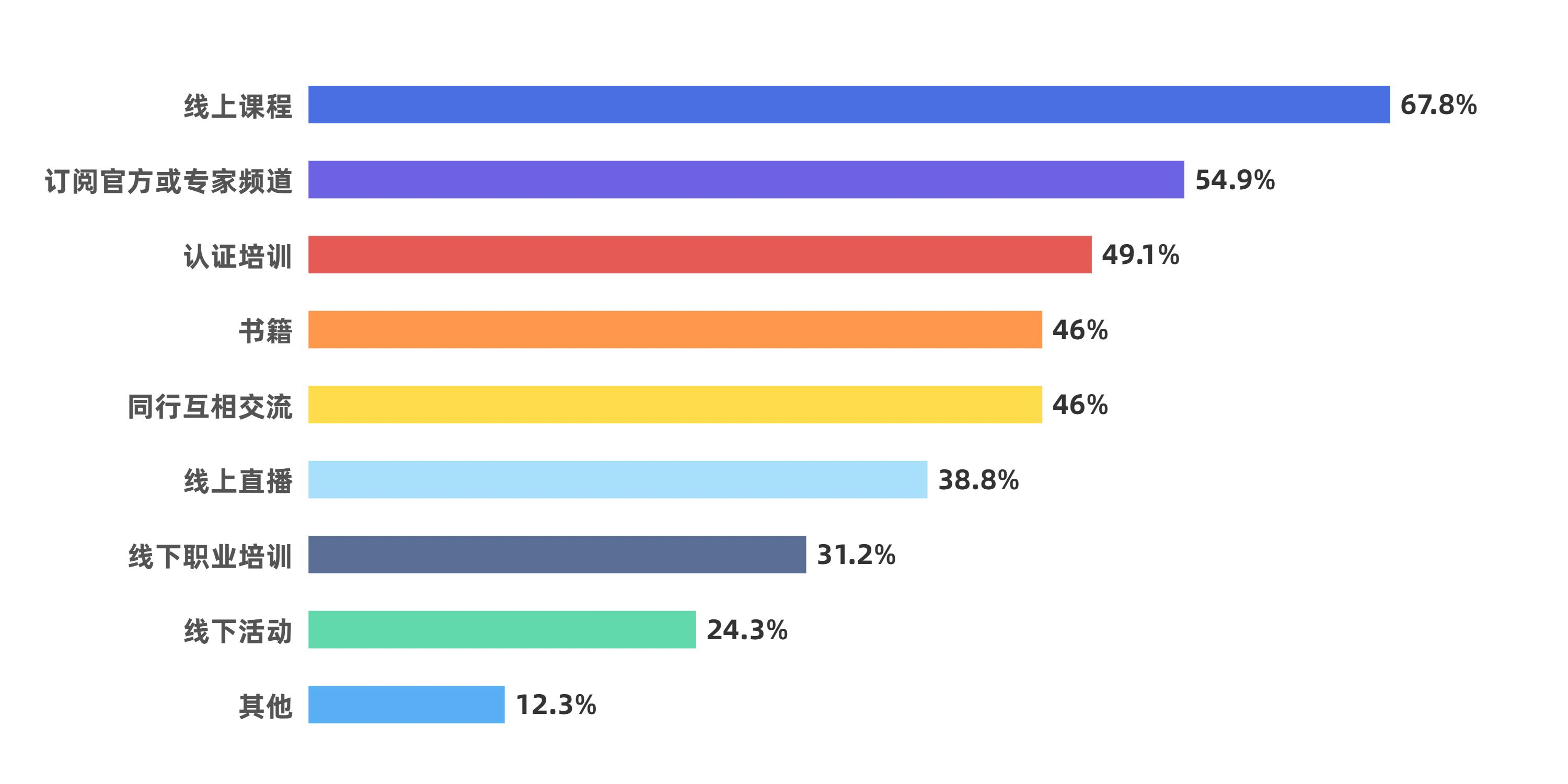 数据显示,互联网是从业者们主要选择的学习提升渠道,且线上课程作为第一选择,不受工作年限、企业规模、受教育程度、职位角色等因素影响。67.8%的受访者选择线上课程提升自己,订阅官方或专家频道、认证培训是他们的次要选择,分别占比54.9%、49.1%。此外均有46%的从业者们会通过技术书籍和同行相互交流进行学习,这与书籍的系统性、专业性有关,也说明了技术人之间的交谈也是有利于提升的有效方式。