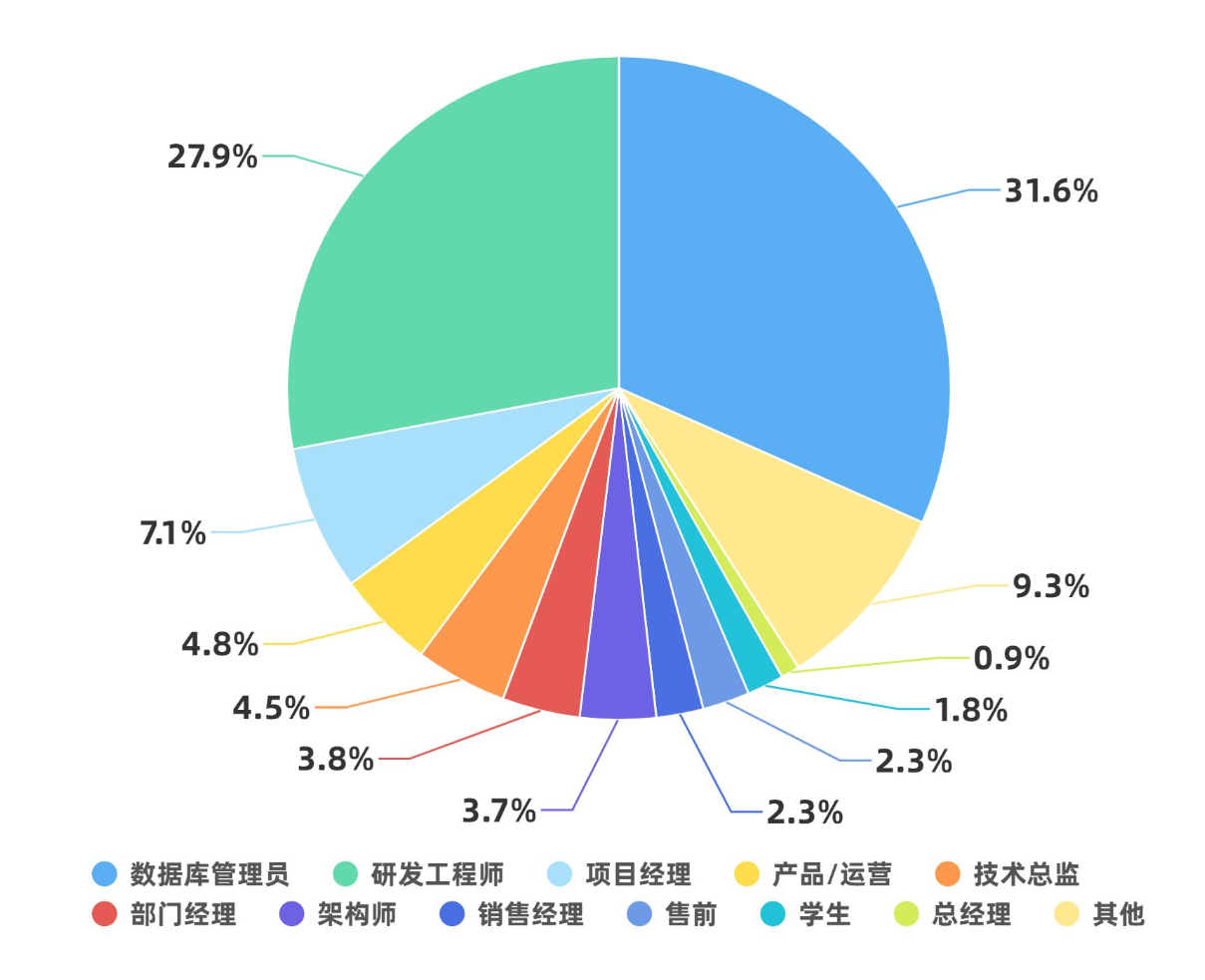 首先为大家介绍本次调研对象的职业分布情况。根据调查对象的具体职位划分,本次调查中,数据库管理员在所有受访者中占比超三成,其次,研发工程师占比达到了28%。