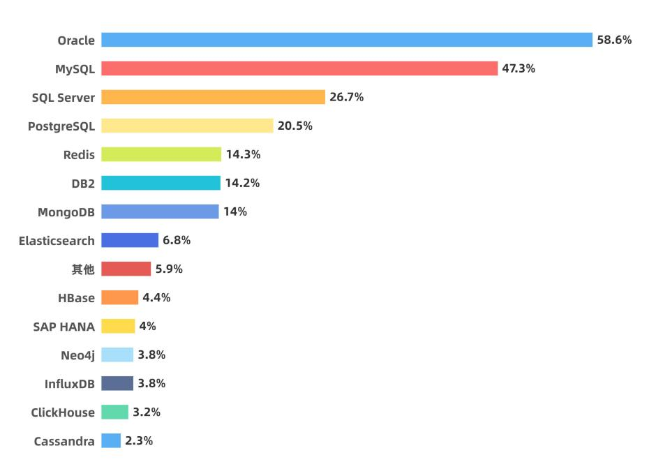 可以发现,MySQL、Oracle 是国内最受欢迎的两款国外数据库产品,其使用率已与其他国外数据库产品拉开较大差距,其中 Redis、SQL Server、PostgreSQL、MongoDB、Elasticsearch的使用率均已超过20%。