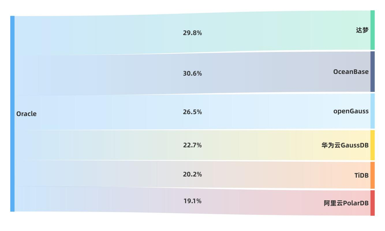调查数据显示,有58.6%正在使用 Oracle 数据库的受访者表示其企业有替换掉国外数据库的意向。其中30.6%的受访者表示想要替换成 OceanBase, 其次是达梦和 openGauss,分别占比29.8、26.5%。