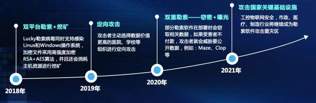 从外部来看:在显著黑产利益驱动下,以勒索病毒为主的外部攻击正在向大规模数据窃取转变,新时期外部攻击呈现:专业犯罪集团介入、定向化程度更高、勒索金额更高、发生频次更高、攻防级别更高、影响更恶劣等特点。