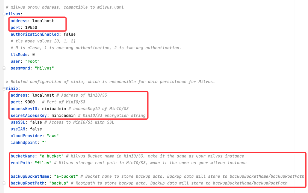 Milvus 需要连接执行备份/恢复的集群以及其使用的 minio,相关的配置见 configs/backup.yaml 文件。配置项和 Milvus 极为相似。