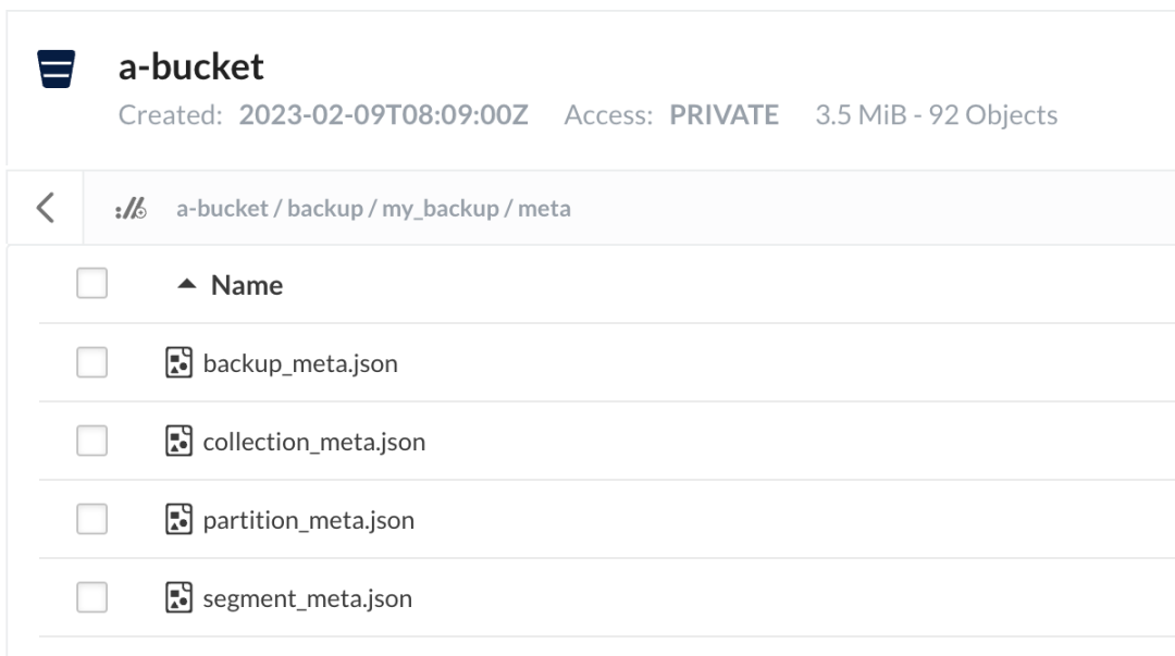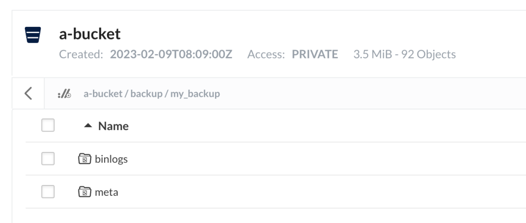 可以看到在 a-bucket/backup(和配置一致)路径下以备份的名字创建了路径 my_backup,下面有两个文件夹分别存储着备份的元数据(meta)和真实数据(binlog)。