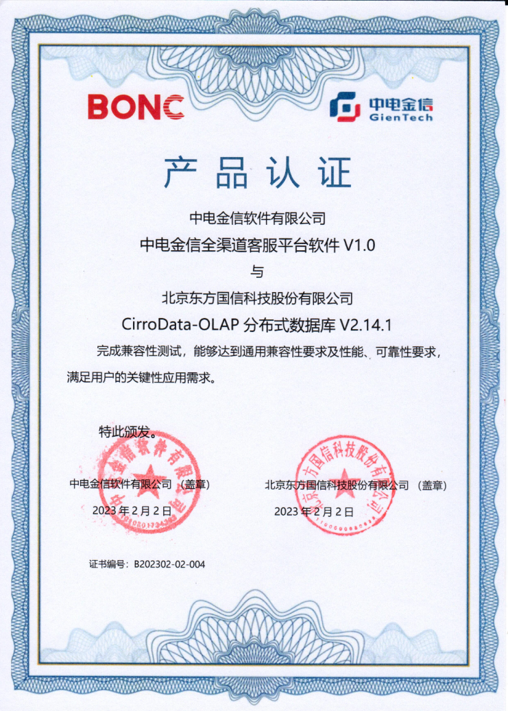 近日,东方国信CirroData分布式数据库与中电金信软件有限公司完成了产品兼容互认证工作。双方测试结果证实,CirroData-OLAP 分布式数据库 V2.1X 与 中电金信客服中心系统 V 1.0 完全兼容,能够达到通用兼容性要求及性能、可靠性要求,整体运行稳定,能够满足关键应用性需求,为企业级用户提供自主可控、安全可靠的系统保障。
