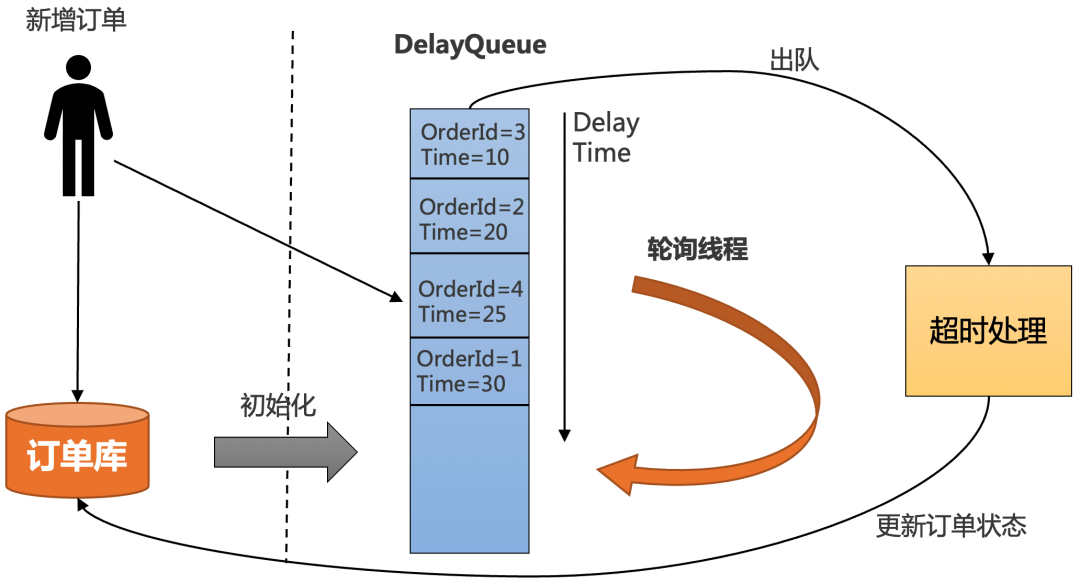 起一个线程不停轮询队列的头部,如果订单的超时时间到了,就出队进行超时处理,并更新订单状态到数据库中。