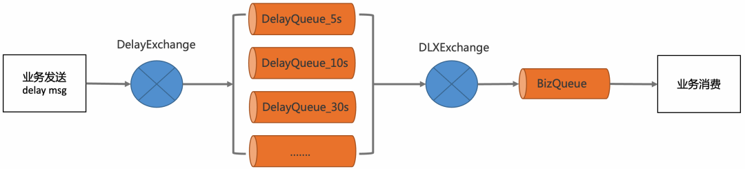 定义一组延时队列DelayQueue_xx,分别配置不同的TTL,用来处理固定延时5s、10s、30s等延时等级,并绑定到DLXExchange。