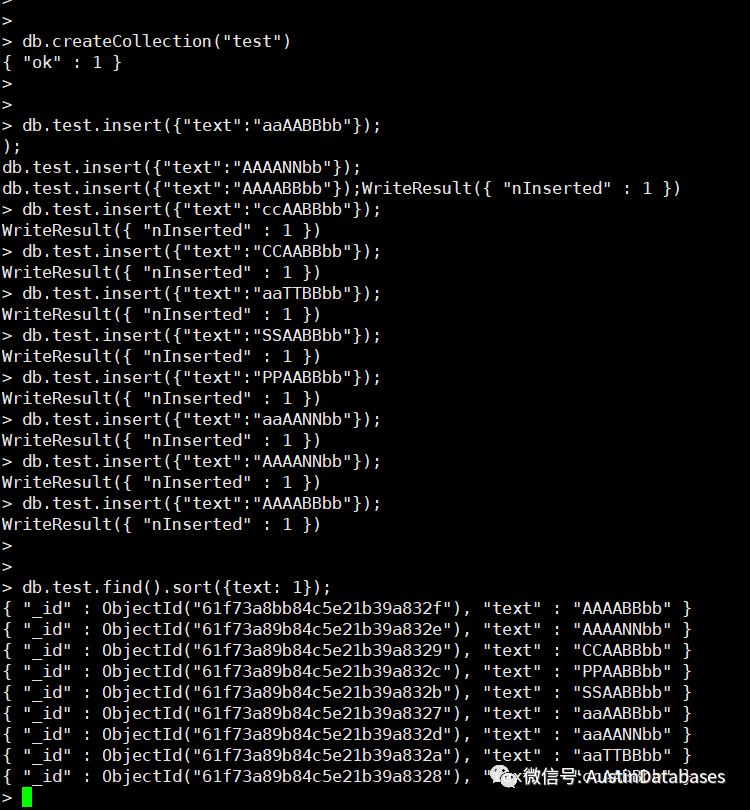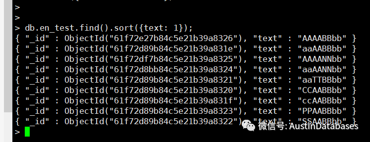 那么如果我们如果针对这个字符,不进行相关的处理,结果会是怎么样?下图给出了结果,在没有任何collation设置的情况下,MONGODB 对于数据的处理,并未根据字符的特性来进行大小写的排序操作。
