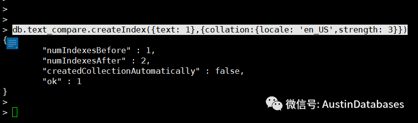 db.text_compare.createIndex({text: 1},{collation:{locale: 'en_US',strength: 3}})