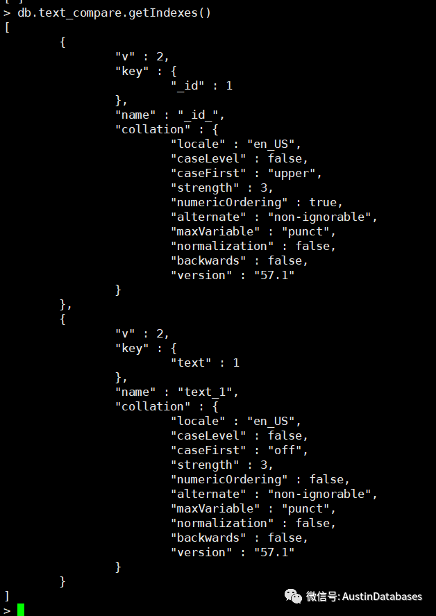 在MONGODB 中也存在collation的问题,在MONGODB 的string 文本类型的都存在这个问题。针对于MONGODB的 collection ,view, index等都涉及特定操作针对collation的操作。因为如果我们不进行这个操作,MONGODB 对于这些数据的操作将采用普通的二进制字符串来对比。