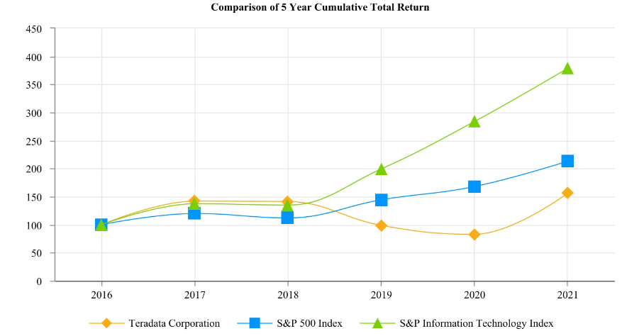 将Teradata与美股的标准普尔500指数、标准普尔信息技术指数进行综合对比,来看Teradata的相对表现。假设投资者在2016年12月31日进行100美元的投资,计算到2021年其获得的收益,如下图: