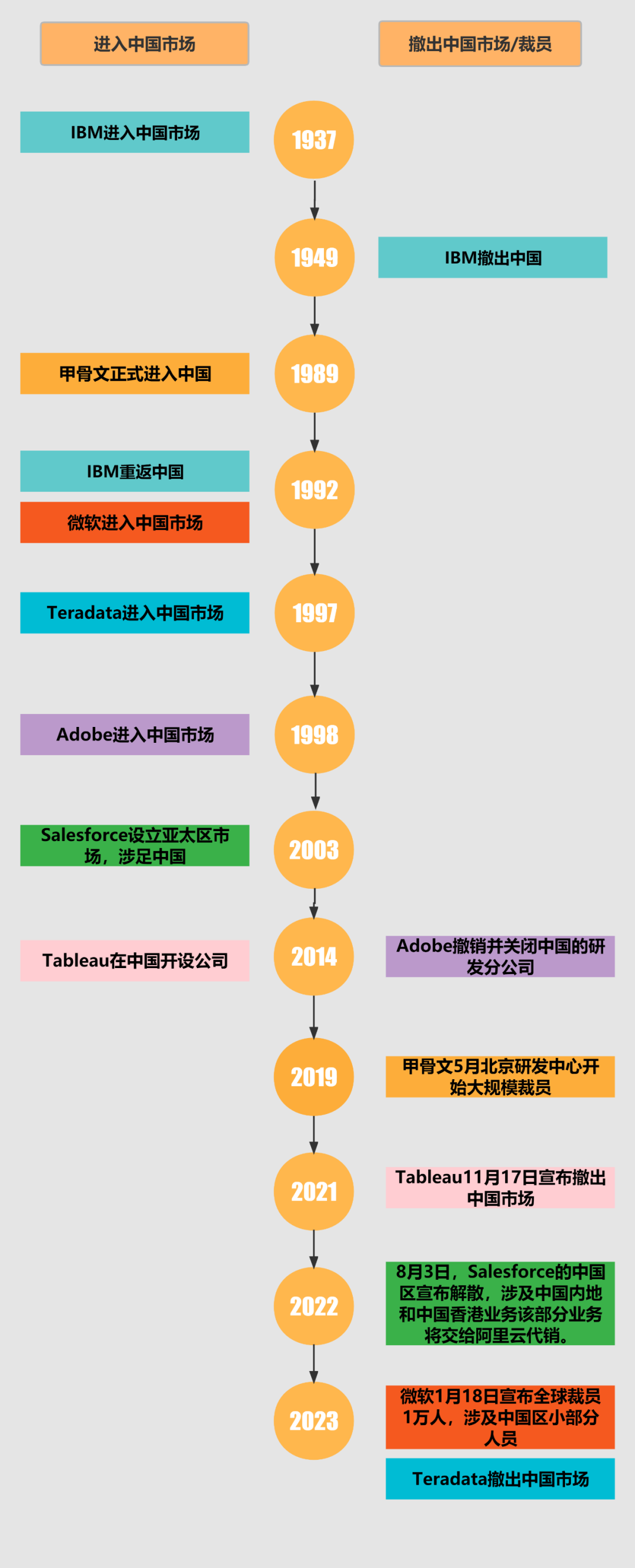 下图统计了IBM、微软、甲骨文、Adobe、Salesforce、Tableau进入和退出/中国区裁员的时间节点。