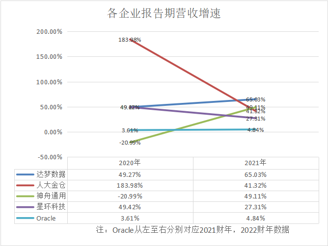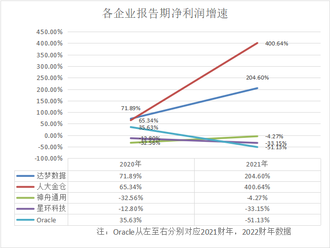 在数据猿发布的《谁将成为中国的“甲骨文”?》一文中,系统分析了中国的数据库国产化替代情况。我们选取了达梦数据、人大金仓、神舟通用、星环科技四家国内数据库厂商,与Oracle进行对比。虽然在业务规模上国产数据库厂商跟Oracle的差距还很大,但发展态势却比Oracle好很多。无论是营收增速还是利润增速,几家国产数据库厂商普遍高于Oracle。