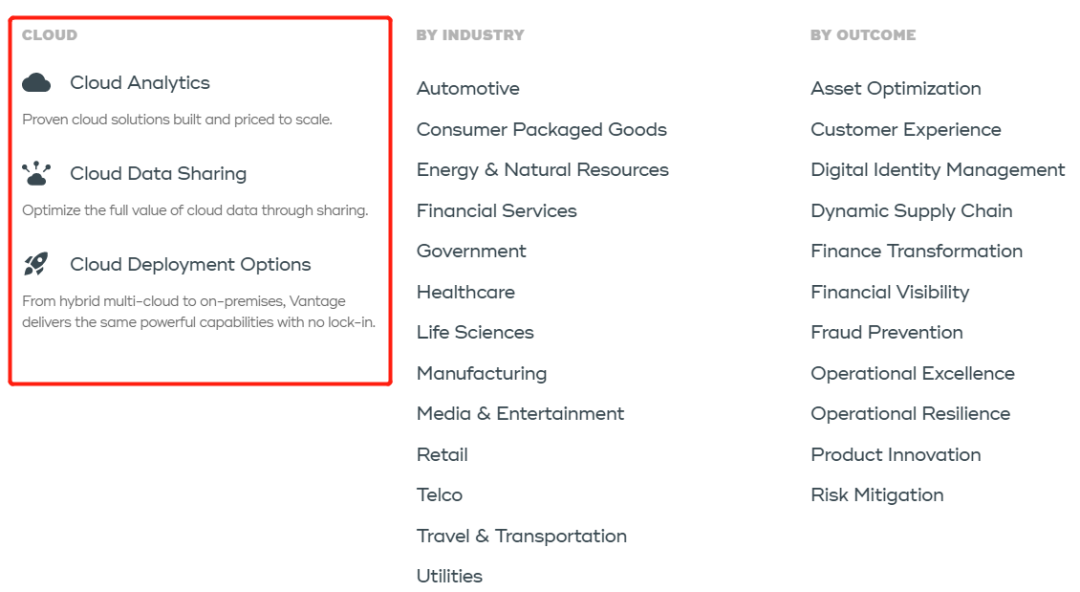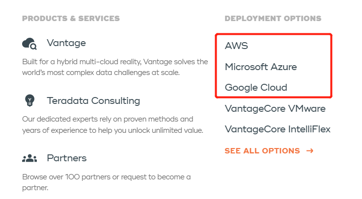 Teradata的整体收入和利润情况虽然并不亮眼,但其云转型还是取得了较大的成功。成立于1979年的Teradata,目前已经是有着44年历史的老牌数据仓库企业,其从2019年开始才全力云转型,致力于成为以云数仓为核心的数据平台厂商,并推出了Vantage Cloud数据平台。Vantage是一个可实现跨云部署的弹性数据平台,可在AWS、Microsoft Azure和Google Cloud这三朵全球最大的公有云上实现跨云部署。