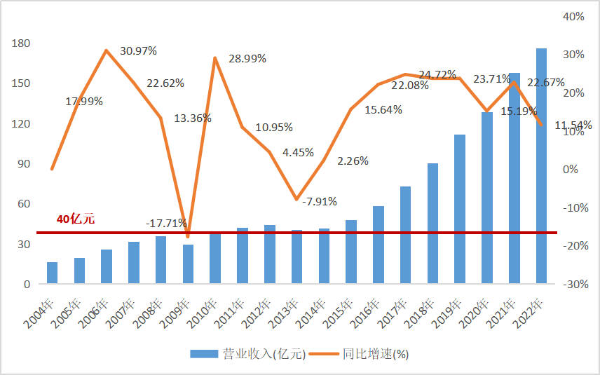 2004-2023年Adobe营业收入及同比增速(单位:亿美元) 来源:Adobe历年年报数据,数据猿整理
