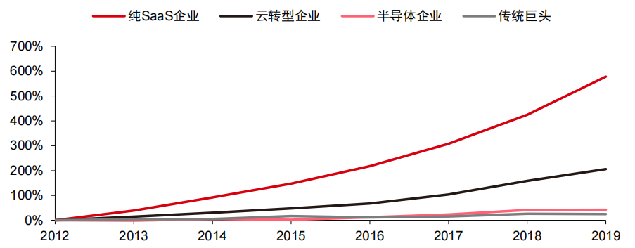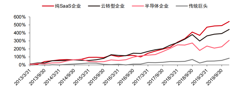 在美国,SaaS发展的如火如荼,涌现了一大批市值几百亿美元以上的巨头。大体上看,美国云计算企业可以分为以Salesforce、ZOOM等为代表的纯SaaS企业,和以微软、Oracle为代表的云转型企业。在美股市场,这两类云计算企业的收入和市值涨幅,都实现了近10年的稳定高速增长。