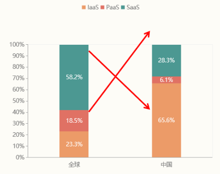 反观中国,跟美国的云计算存在结构性差异:美国云计算SaaS占大头,中国云计算IaaS占大头。