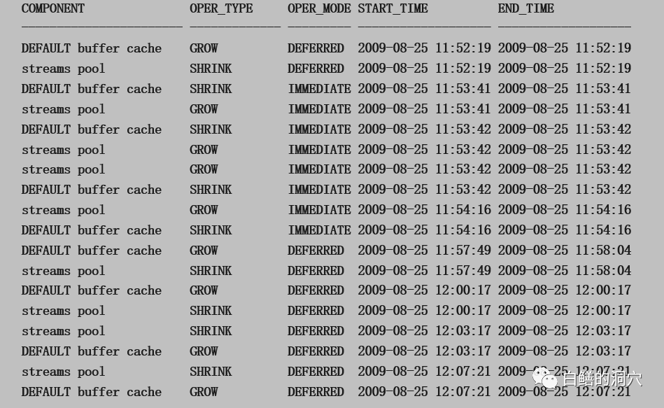 上面的案例是没变化,从中看不出异常来,如果BEGIN/END有差异,而且差异比较大,那么我们就要关注SGA的性能是否存在问题了,是否存在SGA抖动了。11g以后的版本的AWR报告中就有SGA RESIZE的情况,你可以在后面去查看,如果是10g的数据库,那么,可以到相关的视图中国去查看SGA RESIZE的情况。