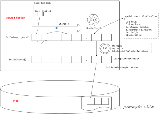 刷写脏页由函数CheckPointBuffers->BufferSync完成:(1)遍历buffer描述符数组,找出脏页,存储到CkpBufferIds数组,数组元素结构为CkptSortItem。(2)对CkpBufferIds数组进行排序,便于范围刷写,减少随机IO。(3)对数组CkpBufferIds中每个脏页,对齐进行write,并判断刷写的页数是否达到checkpoint_flush_after,达到阈值则调用函数IssuePendingWritebacks:排序、将连续的页总范围一次性sync。每刷写一次页都需要判断是否需要sleep,由函数CheckpointWriteDelay进行处理,达到阈值,每次sleep 100ms。(4)最后再发起一次IssuePendingWritebacks。