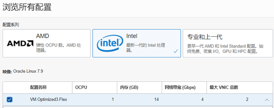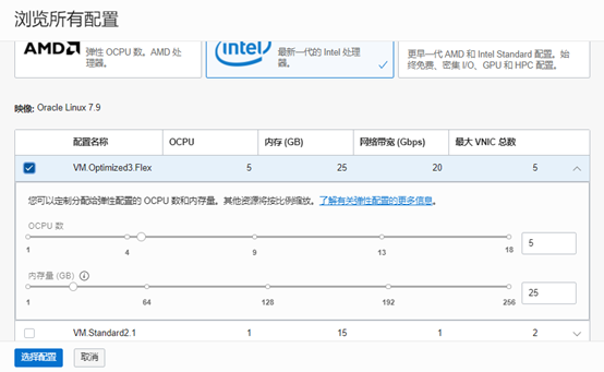 在“浏览所有配置”弹出窗口中选择“Intel”配置,并勾选“VM.Optimized3.Flex”选项。