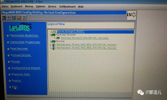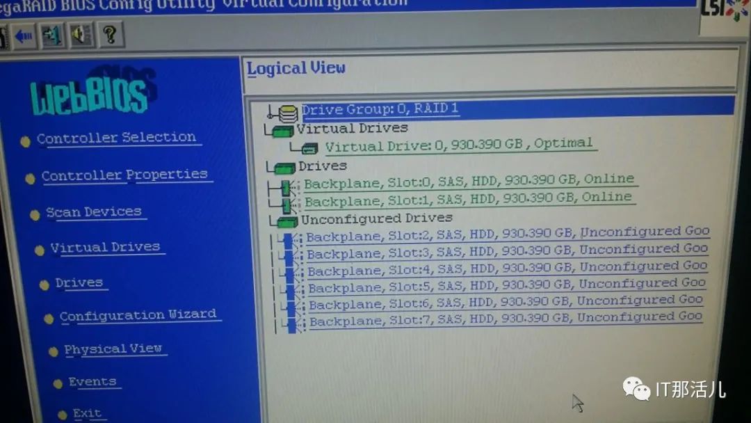当提示按CTRL+H时,进入WebBIOS磁盘阵列设置界面,上图可以看到本机的阵列配置划分已经被识别出来(这台主机是2块硬盘)。无需其他操作EXIT----重启主机。