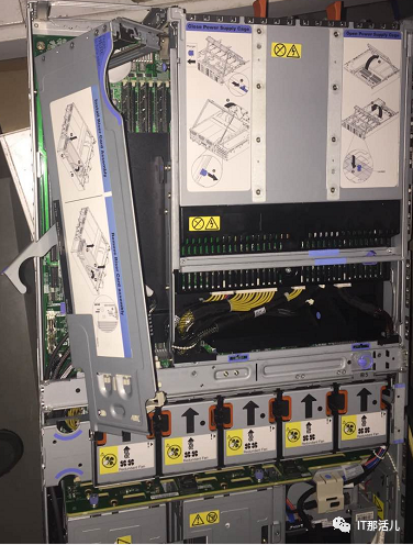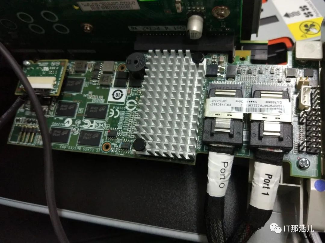 关闭主机电源后,拆掉IBM 3755 M3主机内部左边盖板下的RAID卡(slot 4位置),记录图中三处接线的准确位置(注意Port0和Port1的接线顺序),拔掉三根连接线和故障RAID卡,更换新的RAID卡后并按照之前记录接线方式连接线路。