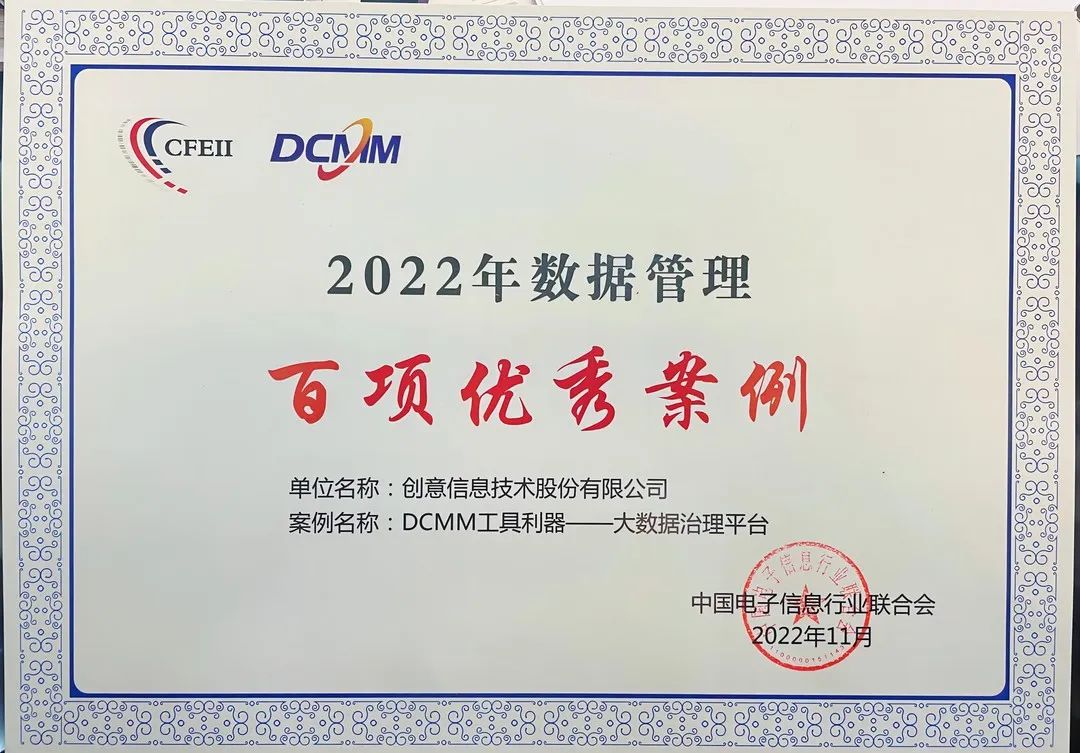 为进一步推进 DCMM 国家标准贯标,助力产业数字赋能、数字赋智和数据赋值,数据要素市场培育,构建数据管理生态体系,做强做优做大我国数字经济。2月17日,由中国电子信息行业联合会主办的“首届中国数据治理年会”在北京召开,大会现场颁发了2022年数据管理百项优秀案例榜单,创意信息“DCMM工具利器——大数据治理平台”获评软件与信息技术服务行业优秀案例并作为代表企业上台领奖。