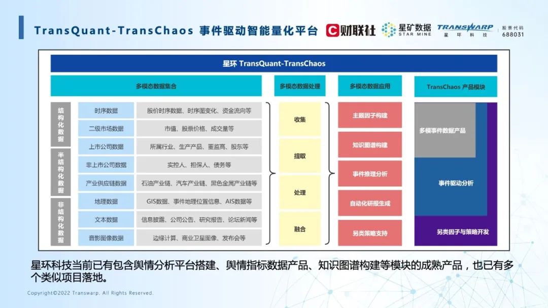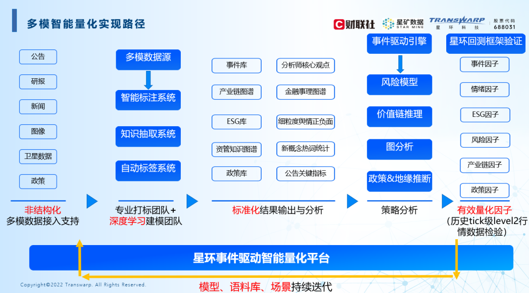 星环科技、财联社联合发布的“多模态事件驱动量化平台”,一方面利用财联社作为金融信息服务机构在新闻驱动策略和事件驱动策略上对业务理解的先天优势;另一方面结合了星环科技在数据技术领域的先进能力,为解决这道市场难题开启了一扇门。