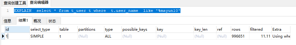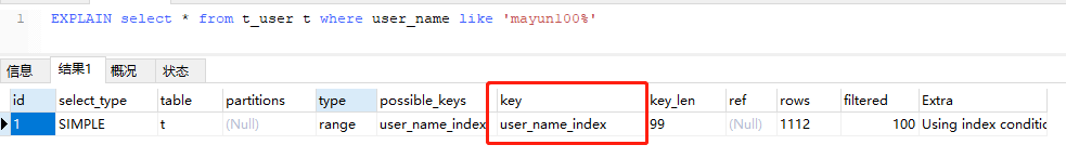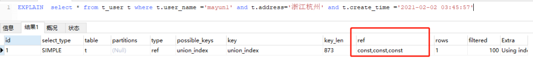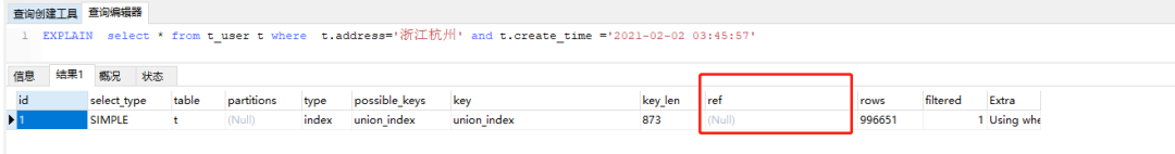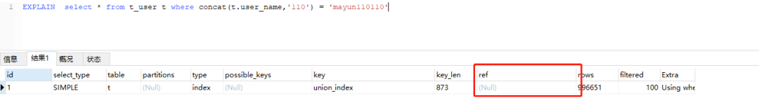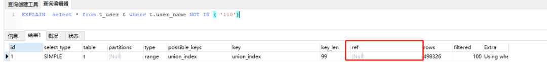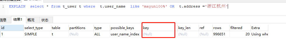 可以看到这条语句没有使用到索引,是因为当or左右查询字段只有一个是索引,该索引失效,只有当or左右查询字段均为索引时,才会生效。