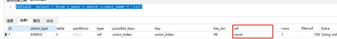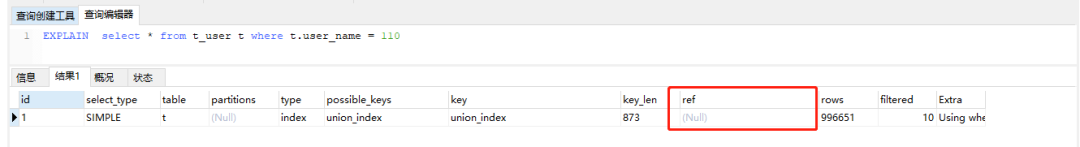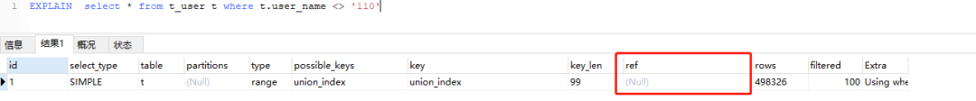 ref:这个连接类型只有在查询使用了不是惟一或主键的键或者是这些类型的部分(比如,利用最左边前缀)时发生。没有值说明没有利用最左前缀原则