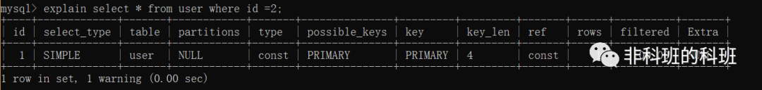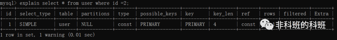 const表示通过索引一次就查找到了数据,一般const出现在「唯一索引或者主键索引中使用等值查询」,因为表中只有一条数据匹配,所以查找的速度很快。例子:explain select * from user where id =2;