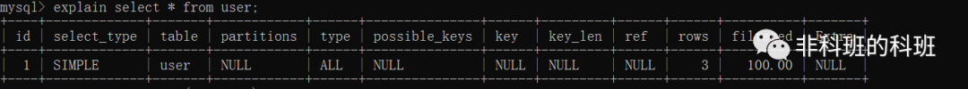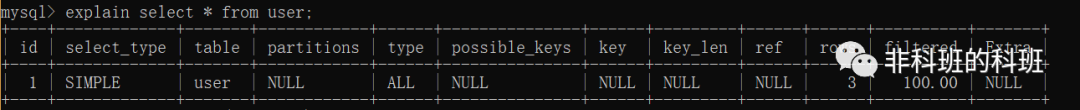 | 1 | SIMPLE | user | NULL | ALL | PRIMARY | NULL | NULL | NULL | 3 | 100.00 | NULL |