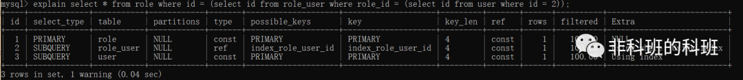 | 2 | SUBQUERY | user | NULL | index | NULL | PRIMARY | 4 | NULL | 3 | 100.00 | Using index |