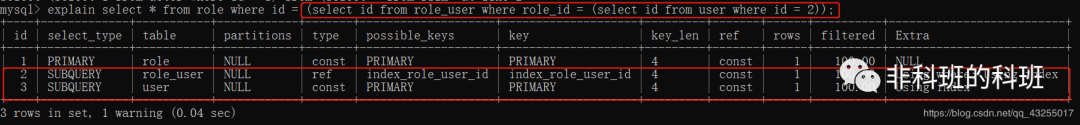 复杂查询中「最外层的select语句的查询类型就是PRIMARY」,例如执行下面的sql:explain select * from role where id = (select id from role_user where role_id = (select id from user where id = 2));