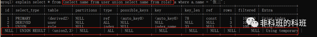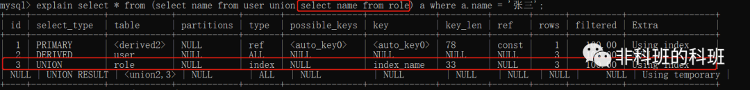「UNION查询语句的结果被标记为UNION RESULT」,如上面执行的sql:explain select * from (select name from user union select name from role) a where a.name = '张三';