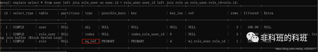 eq_ref表示使用唯一索引或者主键索引扫描作为表链接匹配条件,对于每一个索引键,表中只有一条记录与之匹配。例如:explain select * from user left join role_user on user.id = role_user.user_id left join role on role_user.role_id=role.id;