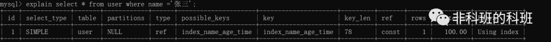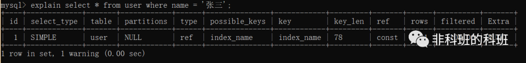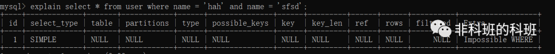 Impossible where会出现在where后的条件一直为false的情况下,这种可以忽视,比较少出现:explain select * from user where name = 'hah' and name = 'sfsd';