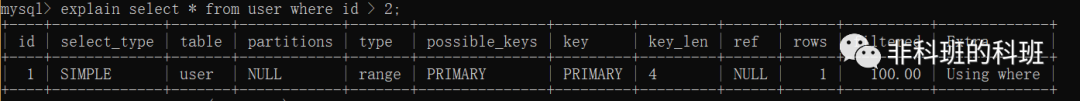 「range使用索引来检索给定范围的行数据,一般是在where后面使用between、<>、in等查询语句就会出现range」:explain select * from user where id > 2;