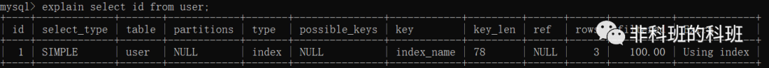 表示查询的列被索引覆盖,这个是查询性能比较高的体现,即所要查询的信息搜在索引里面可以得到,不用回表,索引被正确的使用:explain select id from user where id =2;