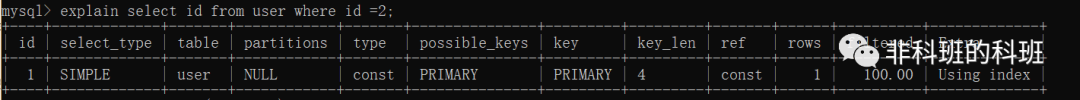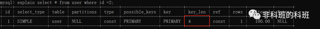 一般来说在不损失精度的前提下,key_len是越小越好,比如上面的测试表的id为int类型,int类型由4个字节组成:explain select * from user where id =2;