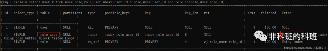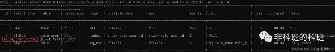 Using join buffer表示使用连接缓存:explain select user.* from user,role,role_user where user.id = role_user.user_id and role.id=role_user.role_id;