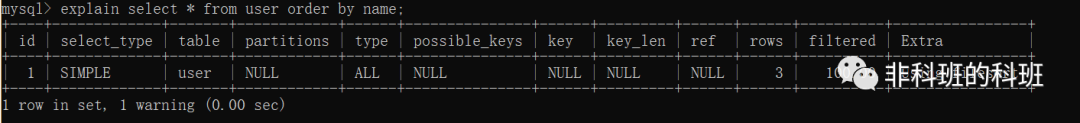 Using filesort表示文件排序,说明Mysql对数据使用了外部的索引进行排序,并没有使用表中的索引进行排序:explain select * from user order by name;