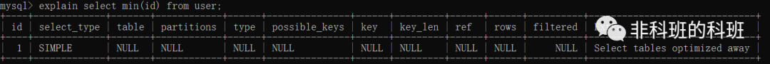 表示select语句没有遍历表或者索引就返回数据了,比如:explain select min(id) from user;