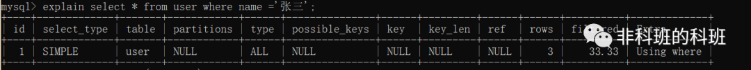 「ALL与index的区别就是ALL是从硬盘中读取,而index是从索引文件中读取」,ALL全表扫描意味着Mysql会从表的头到尾进行扫描,这时候表示通常需要增加索引来进行优化了,或者说是查询中并没有使用索引作为条件进行查询:explain select * from user;