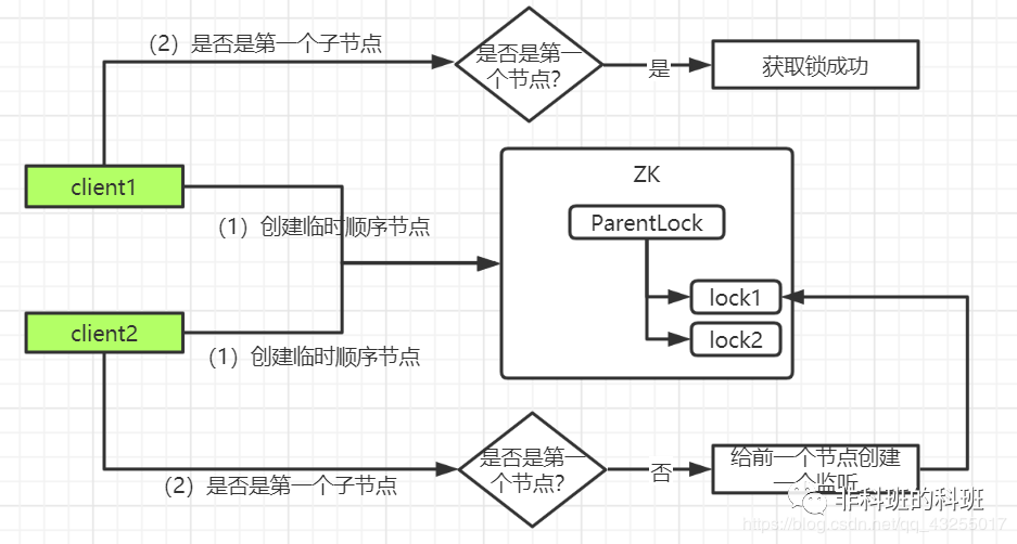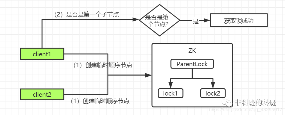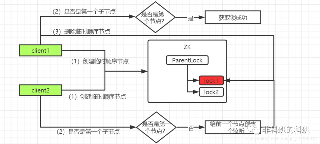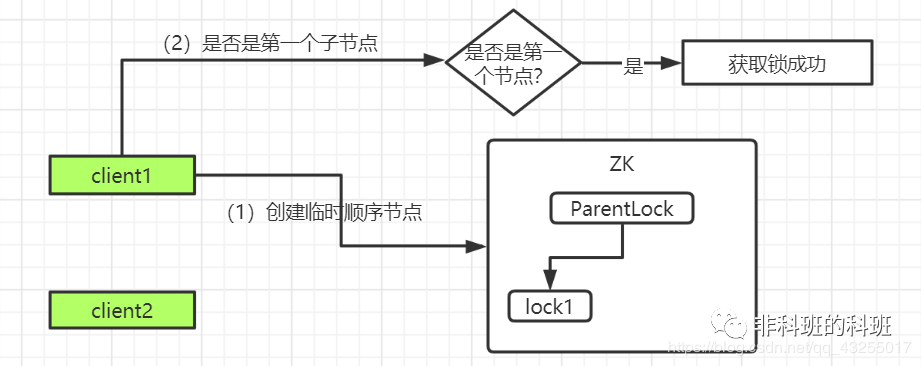 当client1创建完临时顺序节点后,就会检查ParentLock下面的所有的子节点,会判断自己前面是否还有节点,此时明显是没有的,所以获取锁成功。