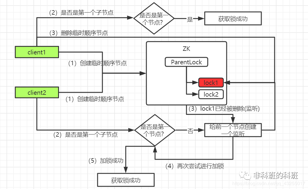 此时就会通知client2:监听的lock1已经被删除,锁被释放,此时client2创建的lock2也就变成了第一个节点,尝试获取所得时候就会获取锁成功。
