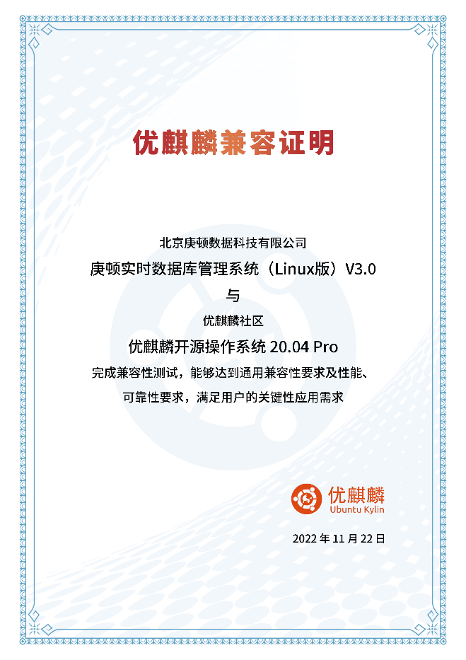 2023年情人节前夕,庚顿数据收到优麒麟颁发的兼容证书,证明庚顿实时数据库管理系统(Linux版)V3.0与优麒麟社区优麒麟开源操作系统20.04 Pro完成兼容性测试,能够达到通用兼容性要求及性能、可靠性要求,满足用户的关键性应需求。作为兼容适配工作起步较早、适配国产CPU、操作系统和服务器最多的国产实时数据库厂商,庚顿数据的信创生态建设一直在持续稳步推进。