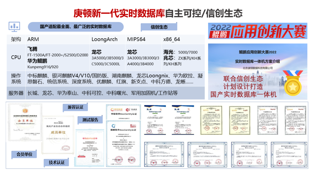 庚顿新一代实时数据库高度重视信创生态建设,作为目前国产适配全面而广泛的实时数据库产品,从国产CPU到国产存储,从国产操作系统到国产服务器,已完成超过140家CPU、操作系统和服务器兼容适配,为企业规划和实施国产化替代创造了良好的信创生态。